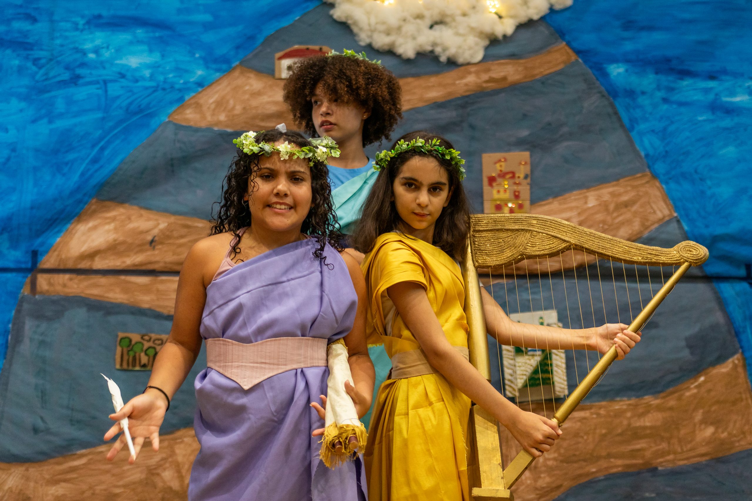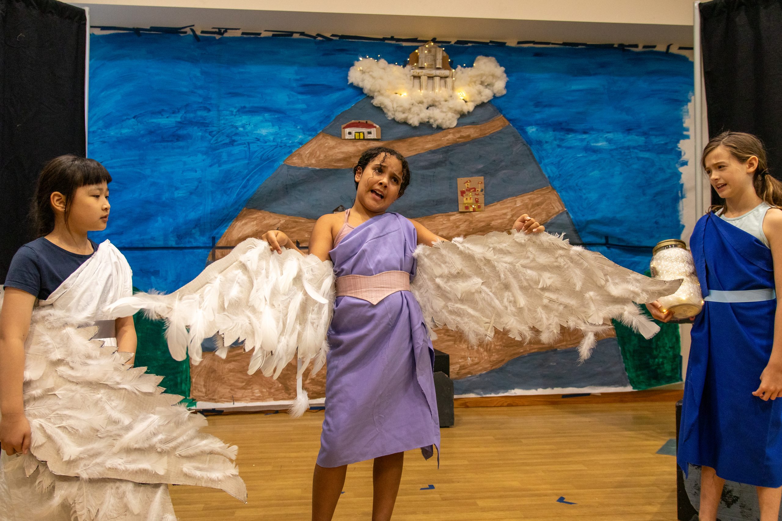 Students in Pandora’s Socks took their comedy skills to the next level! These students were able to design, rehearse, and preform a one-act play in the span of only three weeks. Photos above display their creative sets, props and more! Their confidence was incredible as they mastered the playful story of why Pandora opened the famous box!